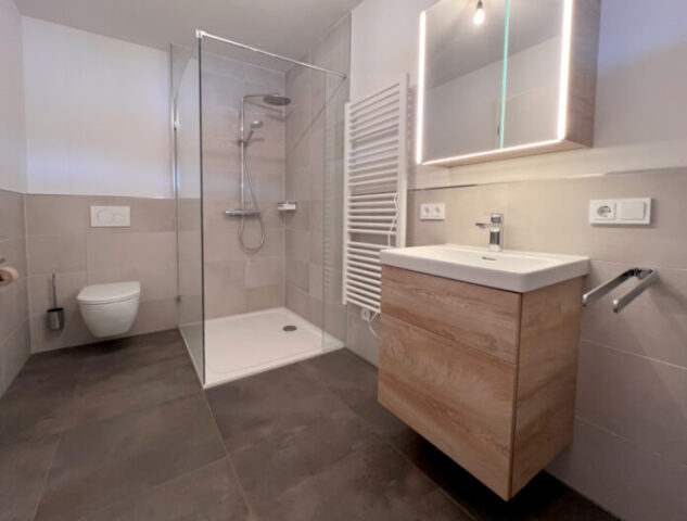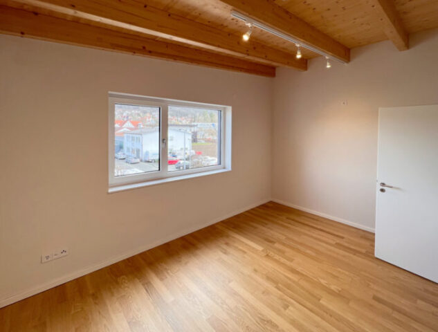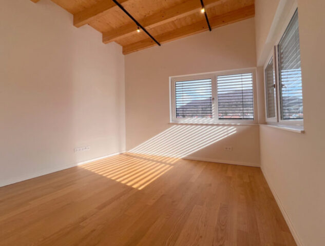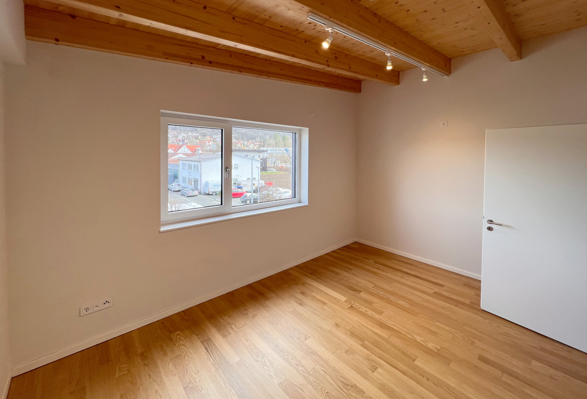 Das Badezimmer wurde bereits mit Einbaumöbeln ausgestattet. Die teilweise überhohen Räume mit Sichtdachstuhl und Einbaustrahlern verleihen der Immobilie eine ganz besondere Wohnatmosphäre.