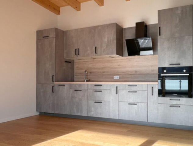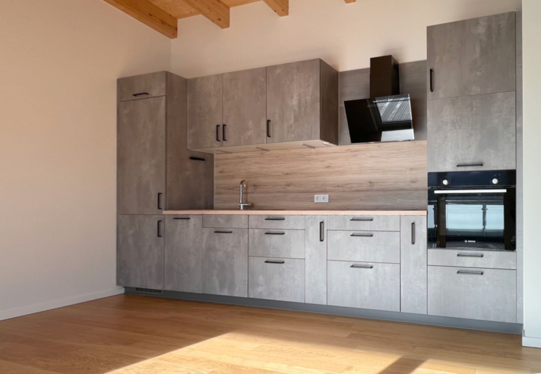 Im weitläufigen, offenen Wohn-Ess-Kochbereich wurde eine hochwertige Einbauküche vom Schreiner samt Elektrogeräten eingebaut.